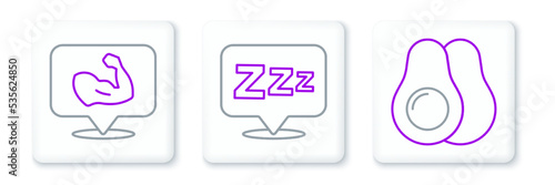 Set line Avocado fruit, Bodybuilder muscle and Sleepy icon. Vector