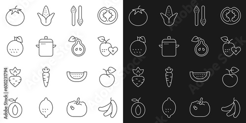 Set line Banana, Peach fruit or nectarine, Healthy, Asparagus, Cooking pot, Orange, Tomato and Pear icon. Vector
