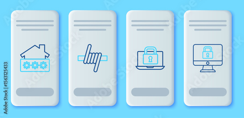 Set line Barbed wire, Laptop and lock, House with password and Lock on monitor icon. Vector