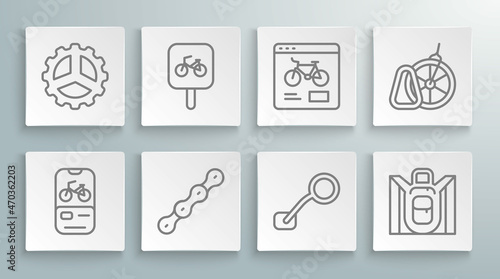 Set line Bicycle rental mobile app, parking, chain, rear view mirror, Hiking backpack, and sprocket crank icon. Vector