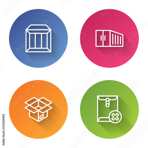 Set line Carton cardboard box, Container, Unboxing and Delete envelope. Color circle button. Vector