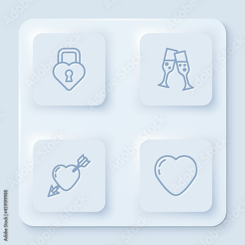 Set line Castle in the shape of heart, Glass champagne, Amour with and arrow and Heart. White square button. Vector