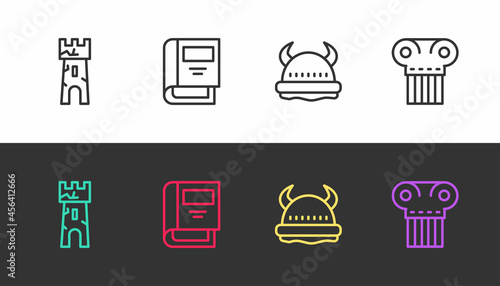Set line Castle tower, History book, Viking in horned helmet and Ancient column on black and white. Vector