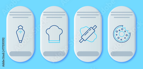 Set line Chef hat, Rolling pin on dough, Pastry bag and Donut icon. Vector
