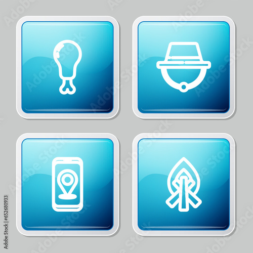 Set line Chicken leg, Camping hat, City map navigation and Campfire icon. Vector