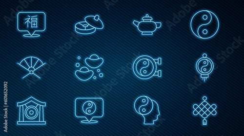 Set line Chinese paper lantern, tea ceremony, fortune cookie, Traditional fan, New Year, Yin Yang symbol and icon. Vector
