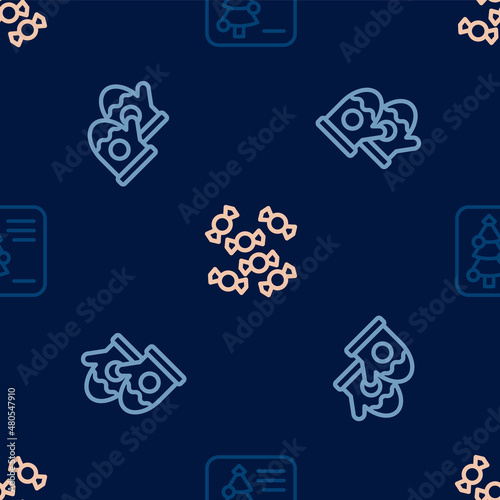 Set line Christmas postcard, mittens and Candy on seamless pattern. Vector