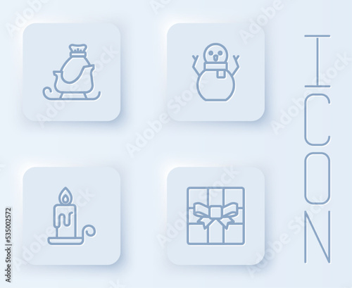 Set line Christmas santa claus sleigh, snowman, Burning candle and Gift box. White square button. Vector