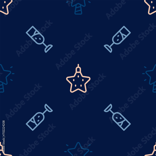 Set line Christmas star, Glass of champagne and on seamless pattern. Vector