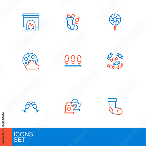 Set line Christmas stocking, mittens, Glass of champagne, Candy, night, lights, Lollipop and icon. Vector