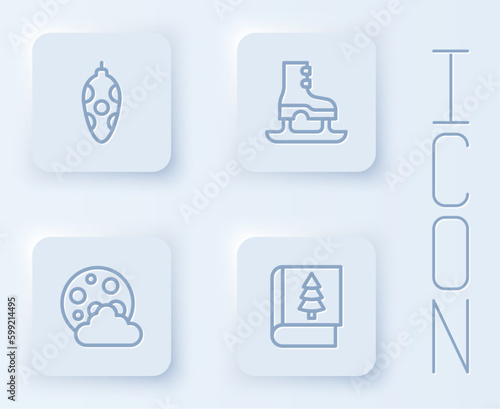Set line Christmas toy, Skates, night and book. White square button. Vector