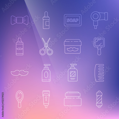 Set line Classic Barber shop pole, Hairbrush, Hand mirror, of soap with foam, Scissors hairdresser, Shaving gel, Bow tie and Cream lotion cosmetic jar icon. Vector