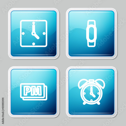 Set line Clock, Smartwatch, PM and Alarm clock icon. Vector
