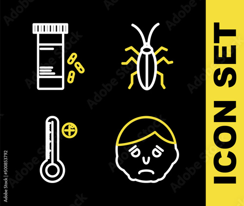 Set line Cockroach, Inflammation on face, Medical digital thermometer and Medicine bottle and pills icon. Vector