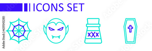 Set line Coffin with christian cross, Bottle potion, Vampire and Spider web icon. Vector