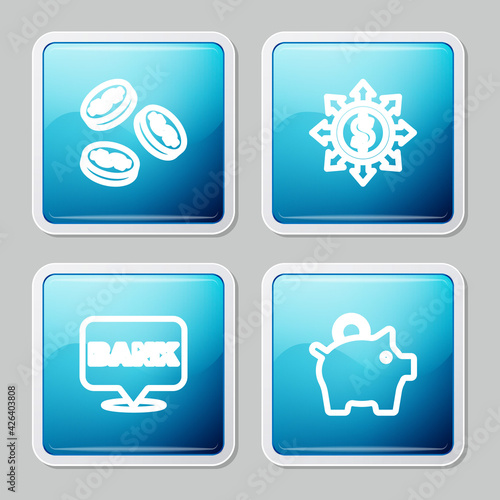 Set line Coin money with dollar, Dollar, share, network, Bank building and Piggy bank icon. Vector
