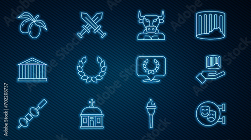 Set line Comedy and tragedy masks, Ancient column, Minotaur, Laurel wreath, Parthenon, Olives branch, and Crossed medieval sword icon. Vector