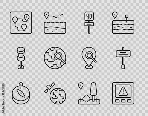 Set line Compass, Gps device error, Road traffic sign, Satellites orbiting the planet, Route location, Magnifying glass with globe, City map navigation and icon. Vector