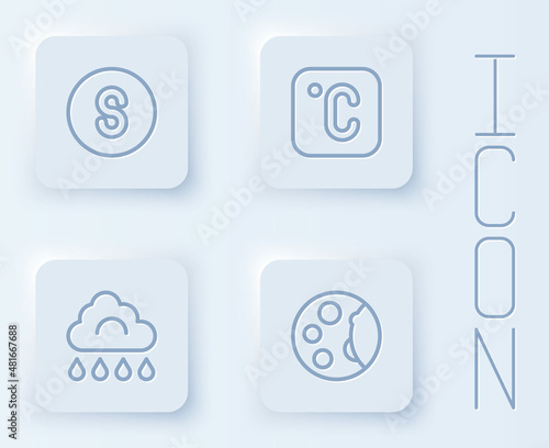 Set line Compass south, Celsius, Cloud with rain and Moon phases. White square button. Vector