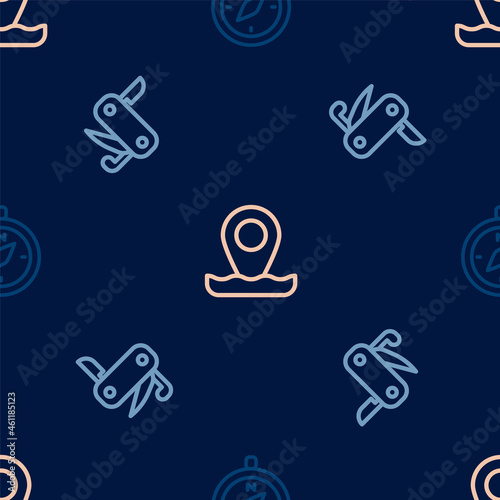 Set line Compass, Swiss army knife and Location fishing on seamless pattern. Vector