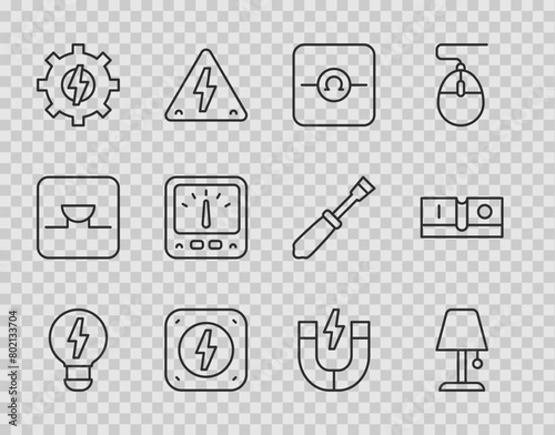 Set line Creative lamp light idea, Table, Ohmmeter, Lightning bolt, Gear and lightning, Ampere multimeter, Magnet and Electric switch icon. Vector