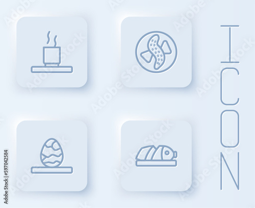 Set line Cup of tea, Served cucumber on plate, Chinese egg and Fish with sliced pieces. White square button. Vector