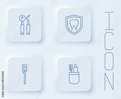 Set line Dental mirror and probe, protection, Toothbrush and toothpaste. White square button. Vector