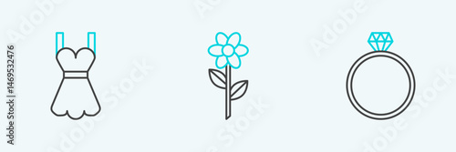 Set line Diamond engagement ring, Woman dress and Flower icon. Vector