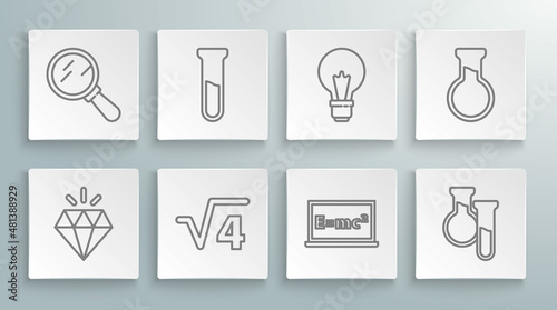 Set line Diamond, Test tube and flask, Square root of 4 glyph, Equation solution, Light bulb with concept idea, and Magnifying glass icon. Vector
