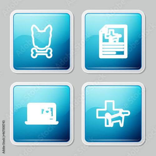 Set line Dog and bone, Medical certificate for dog or cat, Clinical record laptop and Veterinary clinic icon. Vector