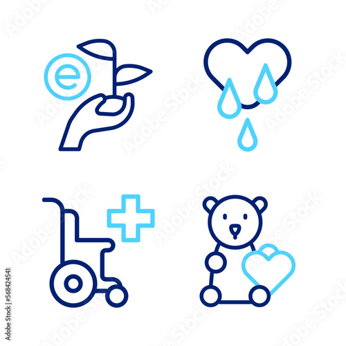 Set line Donate child toys, Wheelchair for disabled person, Blood donation and Leaf in hand icon. Vector