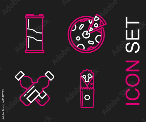 Set line Doner kebab, Crossed bottle of water, Pizza and Soda can icon. Vector