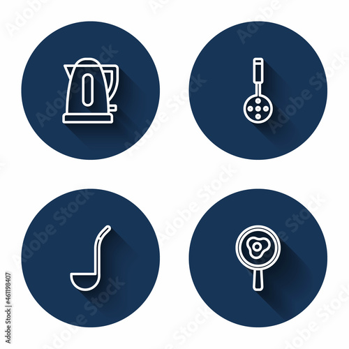 Set line Electric kettle, Spatula, Kitchen ladle and Fried eggs on frying pan with long shadow. Blue circle button. Vector