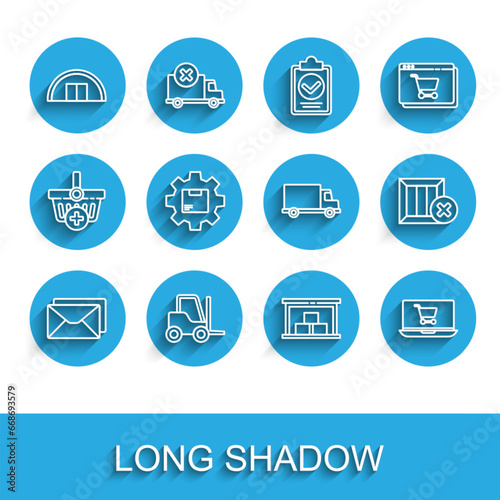 Set line Envelope, Forklift truck, Warehouse, Shopping cart on laptop, Gear wheel with package box, Wooden and delete and Delivery cargo vehicle icon. Vector
