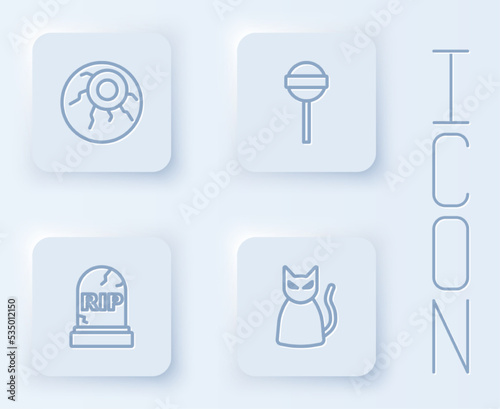 Set line Eye, Lollipop, Tombstone with RIP written and Black cat. White square button. Vector