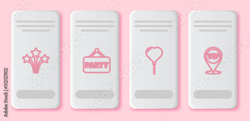Set line Firework, Signboard party, Balloon in form of heart and Location Vip. White rectangle button. Vector