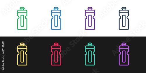 Set line Fitness shaker icon isolated on black and white background. Sports shaker bottle with lid for water and protein cocktails. Vector