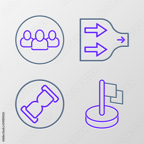 Set line Flag, Old hourglass with sand, Arrow and Project team base icon. Vector