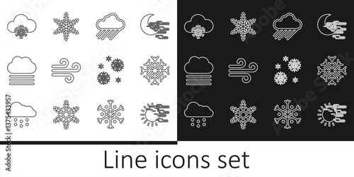 Set line Fog and sun, Snowflake, Cloud with rain, Wind, cloud, snow, and icon. Vector
