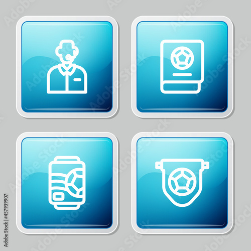 Set line Football or soccer commentator, learning book, Beer can and flag pennant icon. Vector