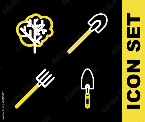 Set line Garden shovel, trowel spade or, pitchfork and Tree icon. Vector