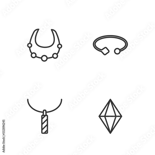 Set line Gem stone, Pendant necklace, Necklace and Bracelet jewelry icon. Vector