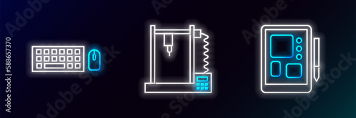 Set line Graphic tablet, Keyboard and mouse and 3D printer icon. Glowing neon. Vector