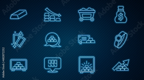 Set line Growth arrow with gold bars, Gold ring, Mine cart, certificate and Falling icon. Vector