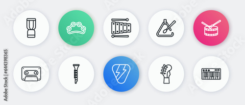 Set line Guitar pick, Drum with drum sticks, Retro audio cassette tape, neck, Triangle musical instrument, Xylophone, Music synthesizer and Clarinet icon. Vector