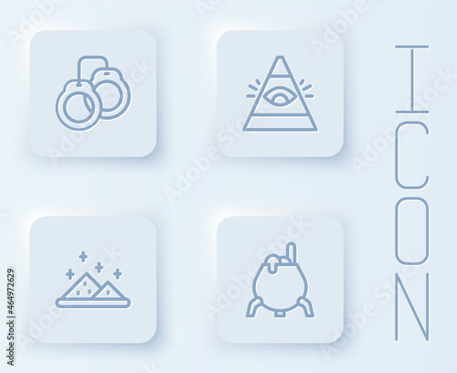 Set line Handcuffs, All-seeing eye of God, Magic powder and Witch cauldron. White square button. Vector