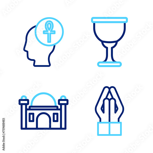 Set line Hands in praying position, Muslim Mosque, Holy grail or chalice and Cross ankh icon. Vector