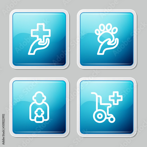 Set line Heart with cross, Animal volunteer, Taking care of children and Wheelchair for disabled person icon. Vector