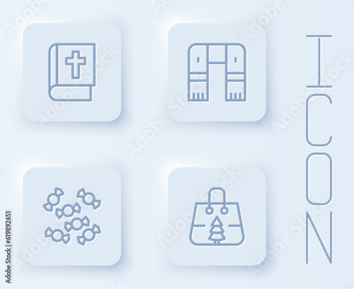 Set line Holy bible book, Winter scarf, Candy and Christmas shopping bag. White square button. Vector