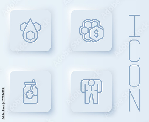 Set line Honeycomb, Sale of honeycomb, Jar and dipper stick and Beekeeper costume. White square button. Vector